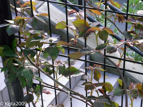 つるバラドンファンの2014年の記録を記していきます。昨年の記録は「つるバラ ドンファン 2013年の記録」に記しています。 2014年3月30日 春の芽吹きも盛んで、葉も茂ってきました。よく見ると、花芽も出てきています。まだ3月というのに花芽が出るとは、今…