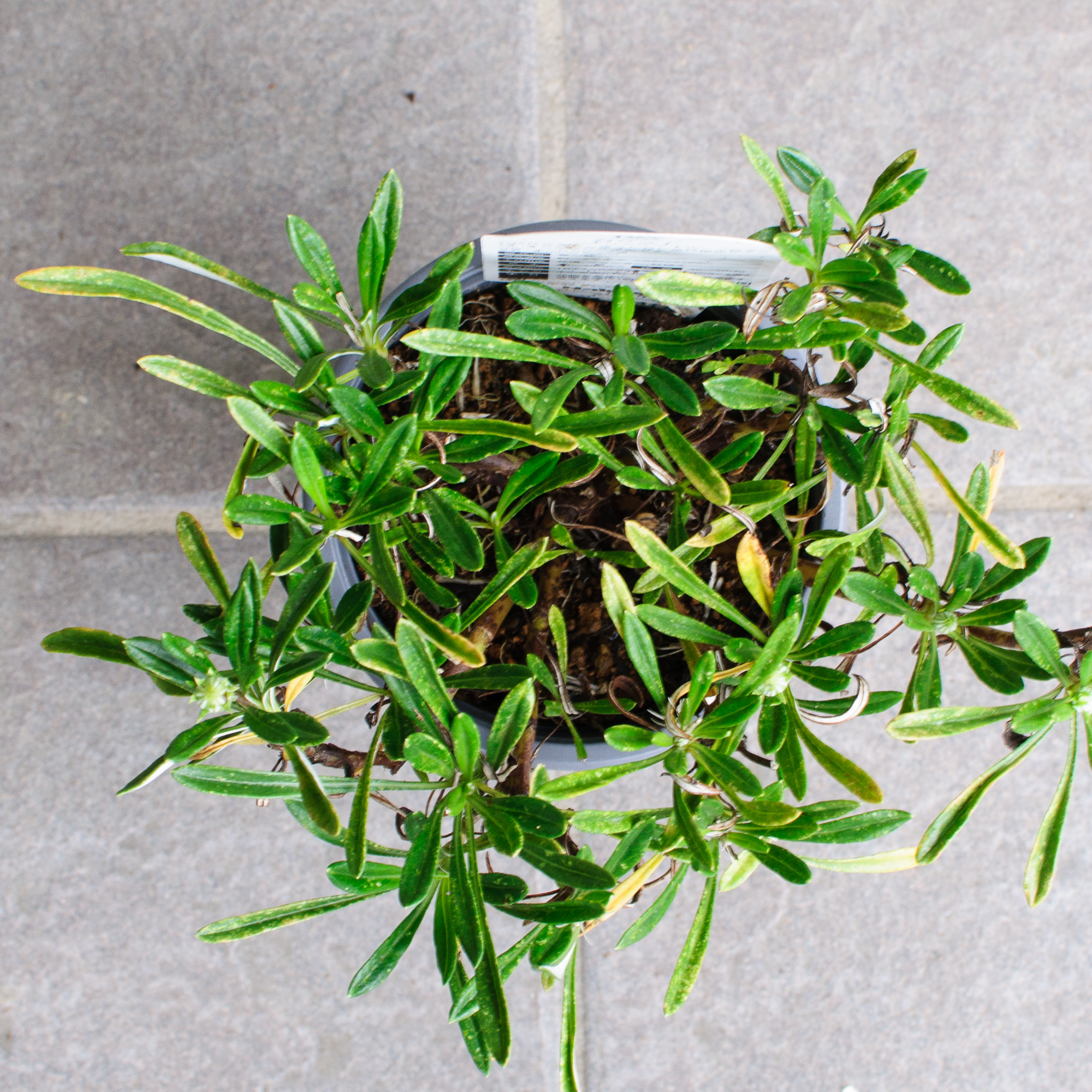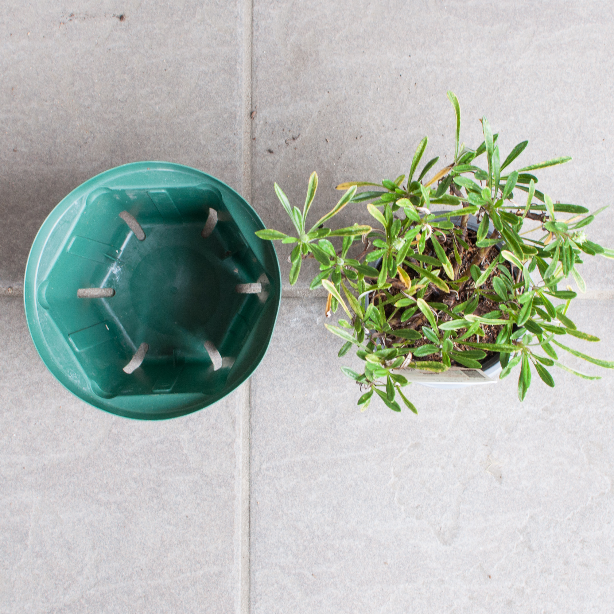 苗は、下の写真のように少し傷んでいましたが、その分値下げされていたので、納得して買いました。株の下葉が枯れていることから、園芸店で何度か水枯れしたのだと思います。一方で、植わっているポットがPWのものだったため、根はしっかり張っているだろうと期待して買いました。PWのポットは、底穴がしっかり開いていて、その上、底穴の高さが高低2段階になっているため、根が良く張っている場合が多いです。